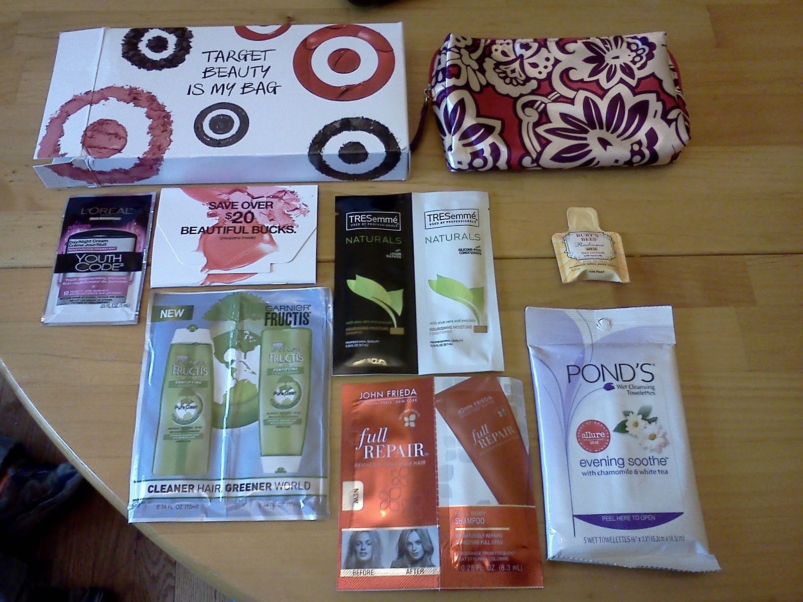 After a long day running errands, I came home to a mailbox that was empty all except a small box. Free Samples from Target! It's like getting a present in the mail. They take so long to ship that you most likely forget that are getting them and they always have fun little presents inside! They also send coupons for more products... if I love one thing as much as I love free samples, it's coupons!
